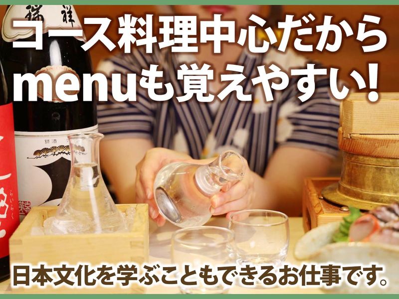 仕事内容 <可愛い着物を着て働けます!> 完全予約制!大人の和料理ダイニングで 一緒に働いてみませんか。 オーダー取りや、配膳等のホール業務をお願いします。 コース料理が中心なので落ち着いて接客できる環境ですよ♪ 【おススメPoint!!】 ●ビジネスマナーが学べます 着物を着ての接客なので、所作はもちろん、 言葉遣いなど、基本のビジネスマナーが自然と身につきます。 着物は、一人で着れなかったスタッフも、 丁寧に先輩が教えてくれるのでどんな不器用さんでも覚えられますよ。 ●たまに…豪華なまかないあり! いつもではないですが、お店のコース料理など、 豪華な賄いを食べられることも。どんなお料理が出てくるか、 楽しみにしていて下さいね! ●三宮駅からスグ!本物の日本料理に出会える割烹料理店です。 普段見ることのない食材や一目見ただけで季節を感じる美しく繊細な盛付など・・・ 日本文化を学ぶこともできるんです。