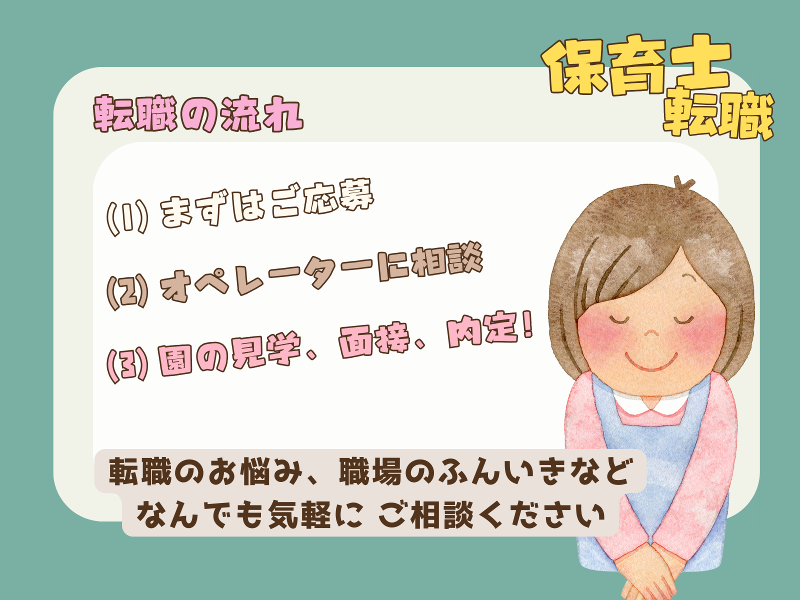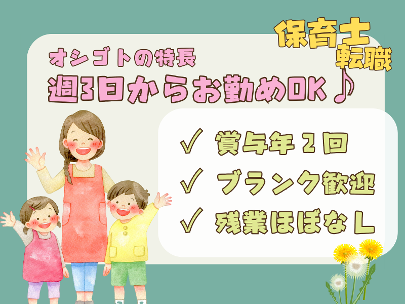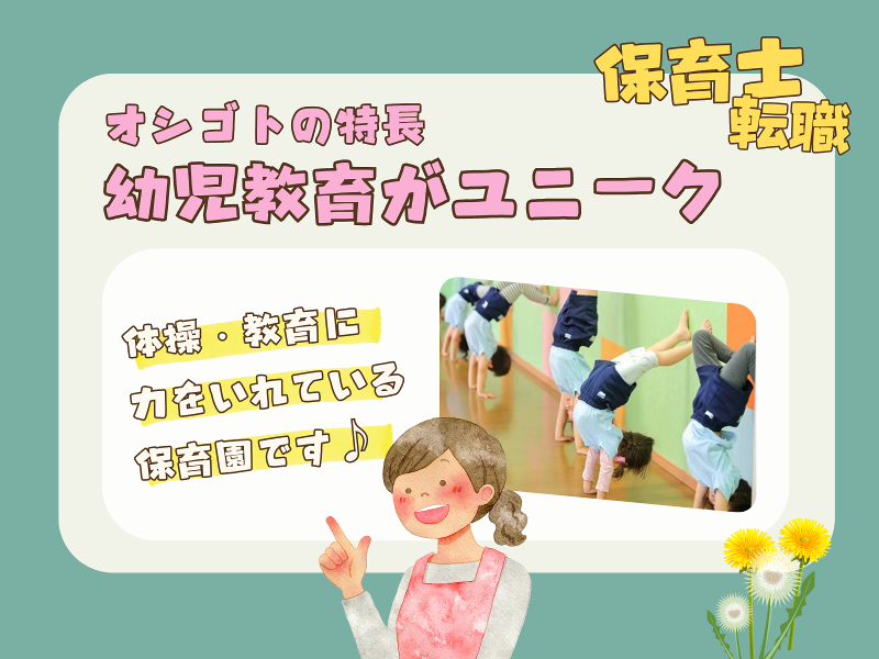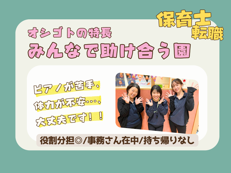 求める人材: 《必須》 ・保育士資格をお持ちの方 《例えば…こんな方を歓迎します》 ・熱意をもって幼児教育に携わりたい方 ・子育てが落ち着いて仕事復帰したい方 ・経験を活かして、好待遇で働きたい方 《資格がない方もご相談ください》 当園ではまだ資格をお持ちでない場合でも、業務内容や本人のご状況によってはお任せできる仕事があります。自分も応募できるかな、子どもに関わる仕事がしたい、そんな方はぜひお気軽にお問い合わせください。(無資格の場合:時給1,263円)