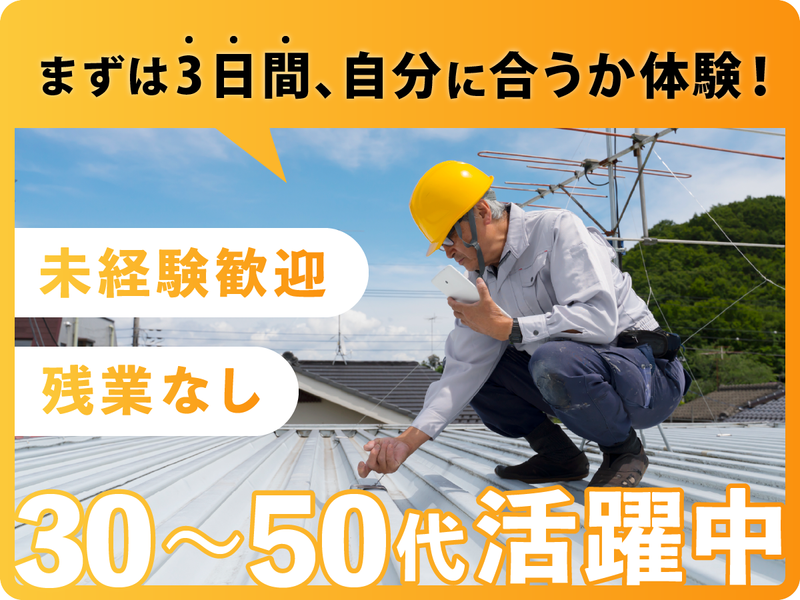 仕事内容 【社長も23歳・未経験からスタート!】 ▷▷いきなり正社員じゃなくてもOK✨ 屋根・外壁・板金工事など、 一生モノの技術が身につく建築仕事。 社長も未経験からスタートしているので、 「何も分からない状態」からでも大丈夫。 わからないことは何でもその場で聞けます! ✅ 未経験歓迎 ✅ 給与保証あり ✅ 残業ナシ・直行直帰OK ✅ お試し入社制度あり / まずは3日間、 「自分に合うか」試してみませんか? \ ・・・・・・・・・・・・・・・・・・・・・・・・・・・・・・・・・・・・・・ 【お仕事内容】 屋根・外壁・板金工事の サポート業務からスタート! ⏩未経験の方は… ●資材準備・片付け ●工具渡し ●外壁・板金作業の補助 など 慣れてきたら施工にも挑戦。 成長に応じて給与もUP! 【現場】群馬県、埼玉県、東京都、 栃木県 など ・・・・・・・・・・・・・・・・・・・・・・・・・・・・・・・・・・・・・・ ⭐働きやすさのポイント⭐  ̄ ̄ ̄ ̄ ̄ ̄ ̄ ̄ ̄ ̄ ̄ ̄ ●直行直帰OK →無駄な移動なし! 現場が終わればそのまま帰宅◎ ●日曜固定休+シフト制 →予定が立てやすく、 私生活とも両立しやすい♪ ●社長と1対1で信頼が築ける →社長自身も23歳・未経験から独立! 仕事のことはもちろん、 「将来どうしたいか」まで 気軽に相談できます◎ ●お試し入社OK(3日間) →期間中は日払い支給で安心! ・・・・・・・・・・・・・・・・・・・・・・・・・・・・・・・・・・・・・・