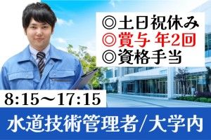 インフォメーション 《日勤専属/8時15分~17時15分/土日祝休み》あなたの「経験と資格」で大学病院の安定を支える!土日祝休み・日勤専属でプライベート充実◇水道技術管理者 ~ 大学病院内でのお仕事です ~ 《群馬大学・昭和キャンパス》 水道法に基づく水道技術管理者に必要な資格要件を満たし実務経験がある方 スキルと経験を活かして一緒に働きませんか 日勤専属+平日のみOK 長期歓迎・フルタイム歓迎 ボーナス・賞与あり(年2回)+資格手当あり 安定の社員登用あり ご応募お待ちしております アピールポイント ◎日勤専属(8時15分~17時15分) ◎予定が立てやすい土日祝休み ◎賞与年2回 ◎資格手当アリ ◎資格取得支援制度あり ◎正社員登用制度あり \ ご応募お待ちしております /