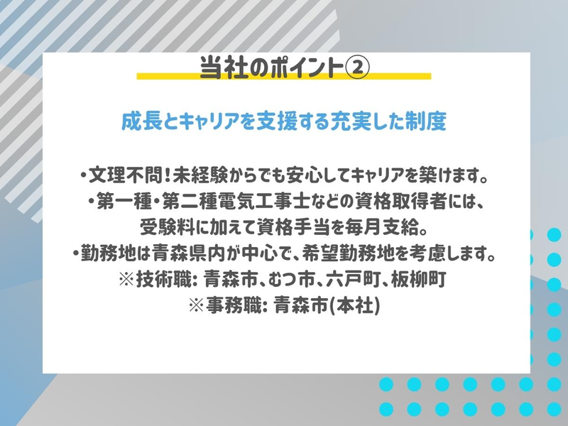 仕事内容 *‥‥*‥ アピールポイント ‥*‥‥* ✨未経験から始められる 電気工事のスキルが身につく仕事 ✨資格取得支援制度あり! 費用は会社負担 ✨年間休日127日でプライベートも充実 ✨賞与年3回支給(前年度実績6.00ヶ月分) *‥‥*‥‥*‥‥*‥‥*‥‥*‥‥* ┏────────────────┓ 未経験からでも安心して始められる 電気工事の技術が身につく環境が 整っています! ┗────────────────┛ 入社後は先輩社員がしっかり サポートするので、 電気工事の知識がなくても心配いりません。 資格取得のバックアップ制度も 充実しており、スキルアップと収入アップを 同時に目指せます。 ⭐具体的なお仕事  ̄ ̄V ̄ ̄ ̄ ̄ ̄ ̄ ̄ ̄ ̄ ̄ ̄ ̄ ̄ ̄ ̄ ̄ ̄ ✅東北電力ネットワーク株式会社の 配電線工事のアシスタント業務 ✅現場での作業サポート ✅必要な資材の準備と運搬 入社後、仕事の幅を広げるための 「中型免許」や「電気工事士」の 資格取得をサポートします。 もちろん、現場で役立つ各種講習の 受講費用は、すべて会社が負担します。 また、仕事に必要なユニフォームや 道具一式もこちらで用意するため、 事前の準備は一切不要です。 当社では専用の社用車でスムーズに 現場へ向かえる環境を整えています。 また、現場経験を活かして 事務・資材管理などの内勤へ キャリアチェンジすることも可能です。 拠点異動によるステップアップもあり、 幅広い成長の道が選べる会社です。 【転勤あり】 青森県内(青森市、六戸町、板柳町) ─────【当社について】───── 当社は安定した経営基盤を持つ 建設業企業です。若い社長のもと アットホームな雰囲気で、 「働きやすくなった」という声が 多く聞かれる職場環境を実現しています。 大手電力グループのインフラ事業を 技術面から支える中核的存在として、 年間売上30億円の達成を見据え、 地域社会への貢献と事業拡大を 推進しています。 電気工事の技術を身につけながら、 安定した環境で長期的に活躍したい方の ご応募をお待ちしています。