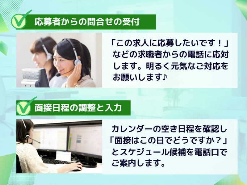 仕事内容 ✨業務拡大のため追加募集!✨ 20~40代のスタッフ多数活躍中! 企業様に代わって、応募者の受付を行う コールセンタースタッフのお仕事です。 ⭐どんな電話が来る?⭐ 「〇〇のお仕事に応募したいのですが…」 「〇〇はまだ募集中ですか?」などの 求職者からのお問合せに応対します。 相手の名前や連絡先を聞いて、 カレンダーのスケジュールを見ながら 面接設定を行います。 (折り返しやリマインド等の連絡として、 こちらから電話を発信するケースもあります) 仕事を探している人と 良い人材を探す企業の懸け橋となる やりがいのあるお仕事です! ⭐どのくらいの件数を対応する?⭐ 1時間当たり平均10件ほど対応します。 (1件平均5分くらい) ⭐コールセンター経験ある方活躍中!⭐ 「就職」「転職」「アルバイト」など、仕事を始めるきっかけは人それぞれ。 応募の一歩には、誰しも少なからず不安があります。 その不安を「安心」に変え、面接へ前向きな気持ちで進めるよう陰から支えるポジションです。 マニュアルも完備していますが、疑問や質問、不安な気持ちに寄り添うことも大切◎ 応募者さまの状況に合わせた柔軟な対応力や、コミュニケーション力が活かせます。 「ありがとう」の言葉がやりがいに繋がる、誰かの背中をそっと押せるお仕事です♪ 未経験スタートの方も大歓迎! 先輩スタッフがしっかりフォローいたします! ⭐フリーターさん大歓迎!⭐ 高時給×フルタイムで月収22万円以上可能! 土日祝はランチ代として1日1000円の支給もあり! しっかり稼ぎながらちょっとオトクに働けちゃいます♪ ⭐子育てが落ち着いた方も活躍中!⭐ 「子どもも大きくなったし少し長めに働きたいな…」という方も大歓迎! 1ヶ月毎に希望を伺ってシフトを作成しているので、家庭の用事や都合にも柔軟に対応可能◎ みんなで協力しながら働きやすい環境作りに努めています♪