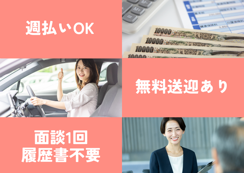 職場環境 ◆ここが人気ポイント! ・未経験OK(8割が未経験スタート) ・車通勤OK/無料Pあり ・週払いOK(規定) ・面談1回・履歴書不要 男女とも活躍中/主婦(夫)・フリーター歓迎
