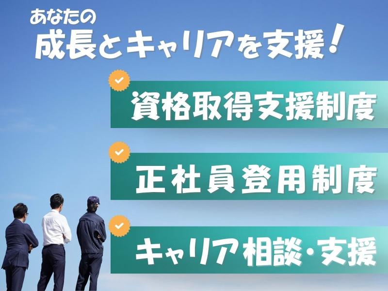 【保険制度】 雇用保険、労災保険、健康保険、厚生年金 待遇・福利厚生: ▼手当・待遇・福利厚生 ・社会保険( 雇用・労災・健康・厚生)完備 ☆入社したその日が加入日です。 ・賞与(年2回) ・退職金制度(規定有り) ・昇給(経験・スキル等により、年1回) ・交通費支給(上限月20.000円、公共交通機関利用の場合30.000円) ・資格手当 5,000円 ・家族手当 3,000円/1人 ・ひとり親手当 最大10,000円 ・休日出勤・深夜手当・残業代支給 ・給料前借制度あり(稼働分) ・有給休暇(6ヶ月後10日付与) ・慶事休暇(結婚・配偶者出産・忌引き) ・慶弔見舞金(結婚・出産・葬祭・傷病・災害) ・定期健康診断/特殊健康診断 ・メンタルヘルスチェック(年1回実施) ・社員登用制度(通常3ヶ月から2年前後で正社員へ登用となります) ☆長期雇用が見込める職場です。 ・無料の資格取得制度(300以上) ・キャリア応援・相談・研修制度あり