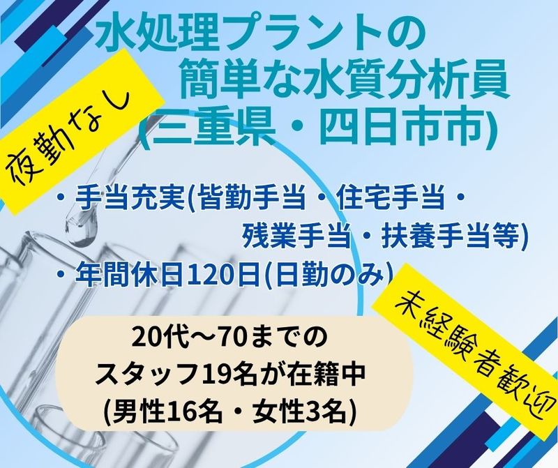 仕事内容 水処理プラントでの簡単な水質分析の業務です 配管の中の水を採取し、 社内に持ち帰り試験管に試薬を入れて、 PH等を測定し分析を行っていただきます 未経験の方でもOJTで わかりやすく指導いたします! 【組織構成】 配属先は水処理施設運転管理部門になります 20代2名(男性) 30代2名(男性) 40代7名(うち女性1名) 50代4名(うち女性1名) 60代3名(うち女性1名) 70代1名(男性) 20代~70代まで幅広い年代の方が活躍中です! ※このお仕事は「正社員」として採用後、 当社が請け負っている仕事の就業先での お仕事になります。 お仕事番号/Chr1306-008