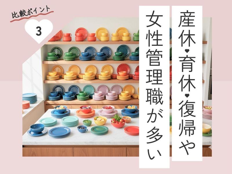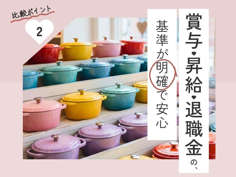 求めている人材 ■応募条件 未経験歓迎! 物販・接客経験やシフト作成経験がある方は優遇します。 ※ご経験に応じ販売員からのスタートを提案する場合があります。 ■募集要項 通勤:車・バイク通勤もOK(駐車場あり) 給与:月給255,300円~※毎年昇給 賞与:年2回・別途インセンティブあり 勤務時間:9時30分~20時30分のうちシフト (早番・遅番/実働7時間30分) ■福利厚生・職場環境 女性が活躍中: 従業員の8割、管理職の7割が女性の職場です。 身だしなみ: 私服勤務OK・購入強制一切なしです。 出費0円、天引きなしがうれしい♪ ネイル、ピアス、髪型は清潔感があれば自由です。 諸手当: 交通費全額支給、退職金制度 産休育休(取得実績多数) 慶弔休暇(有給として付与) ■ユニークな制度 代表からのバースデープレゼント: 毎年カタログギフトが届きます♪ 名刺デザインコンテスト: オリジナルの名刺が持てるチャンス インセンティブアイディア公募: 新しい制度を導入する際は 社員のアイディアが大切にされます。