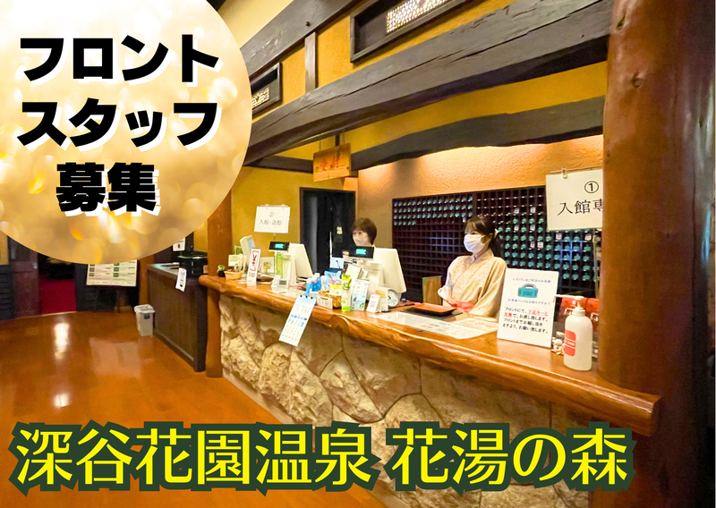 仕事内容 =================== 自然の中にとけ込んでいるような癒し空間♪ 心も体もリラックスできる大人の隠れ家♪ 深谷花園温泉 花湯の森でフロントスタッフ募集 =================== 【お仕事内容】 花湯の森の館内でのフロント対応業務 【具体的には】 ●フロントでのお客様の⼊退館受付、電話応対 ●レンタル品(館内着やタオル)の貸し出し・返却対応 笑顔で丁寧な対応ができれば未経験の方でも大歓迎!! 難しい内容はないので、未経験の方でも楽しく働けます♪ ============ 都心から少し離れた場所に、静かに広がる田園風景。どこか懐かしい匂いのする風景を包み込むように湧いたひとつの泉、それが深谷花園温泉。地下2000mより湧き出した天然の露天風呂をはじめ、壺湯や寝湯、檜風呂といった様々な温泉があり、一日中時間を気にすることなくゆっくりと疲れを癒すことができるほか、心地よい余韻で充実した休日をお過ごしいただけます。 ============