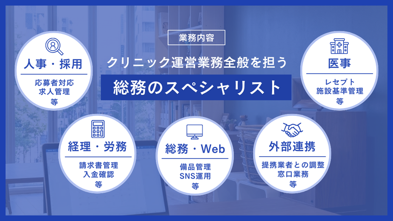 仕事内容: 私たちは、「事務長のアウトソーシングレンタル事務長さん」という革新的なサービスで急成長中のヘルスケアベンチャーです。 私たちは単なる事務代行ではありません。アナログな医療業界に対して、泥臭い支援とデジタルを活用した支援で、スマートで強固な経営基盤を構築する“経営パートナー”です。この事業で当社は日本No.1を目指しています。我々のこの挑戦を共に体験しませんか? ◆ Company Deck 当社の想いについて、詳しくはこちらもご覧ください。 https://x.gd/0VJx6 * 革新的サービス 医療業界の未来を創るアウトソーシングサービス「レンタル事務長さん」を展開。圧倒的なニーズで拡大中です。 * 強力なチーム体制 事務長一人ですべてを担うのではなく、集患、採用、経理等のプロと連携する「事務長 + 専門チーム」で支える仕組み。一人で抱え込まず、プロ同士で連携する体制は、他にはない強みです。 * 成長できる環境 設立以来右肩上がりで拡大中のベンチャーで、事業・組織創りの“ど真ん中”を経験。多様なバックグラウンドを持つ仲間と刺激し合いながら、組織が形作られていく「ベンチャーの醍醐味」を肌で感じられる環境です。 【業務内容】 多岐に渡るクリニックの運営業務全般を担う「総務スペシャリスト」として、医療機関の運営を土台から支えていただきます。 ※最初からすべてをお任せするわけではありません。まずは得意な領域からスタートし、段階的に幅を広げていけるのでご安心ください。 《主な業務内容》 * 人事・採用: 求人管理、応募者対応、雇用契約、面接調整、人事面談 * 経理・労務: 請求書管理、入金確認、入退職手続き給与計算補助、社労士連携 * 総務・Web: 備品管理、SNSの更新・運用(Web広報) * 外部連携: 提携業者(仕入れ先・システム会社等)との調整・窓口業務 * 医事:レセプト、施設基準管理、行政手続き