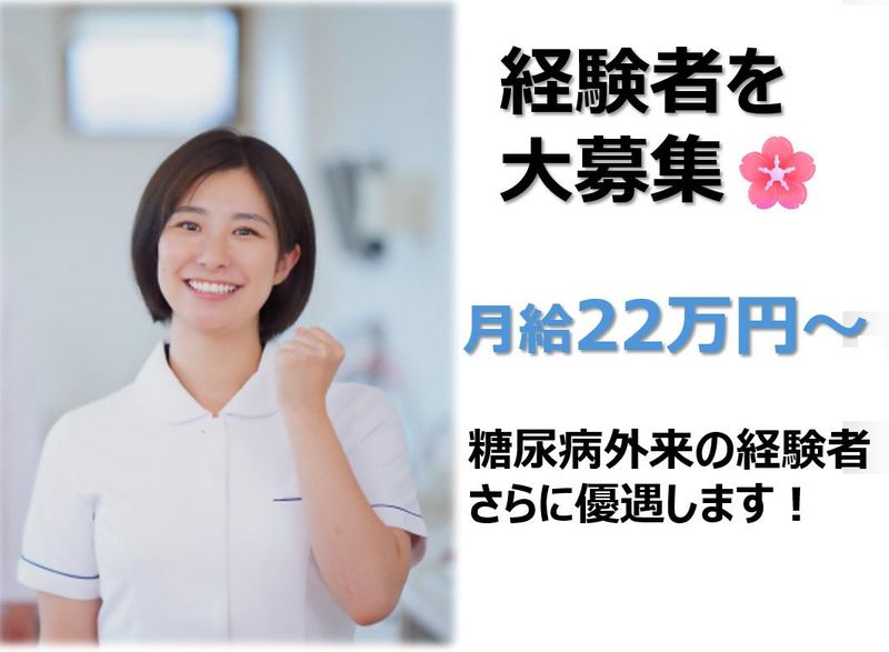 月給220,000円以上 給与詳細 基本給:月給 22万円 〜 固定残業代:なし 【一律手当】 全員に一律で支払われる通勤・皆勤・家族手当金額:なし 全員に一律で支払われるその他手当金額:なし ⭐ご経験・能力を考慮の上、決定いたします。 ⭐糖尿病外来の経験者は優遇いたします。