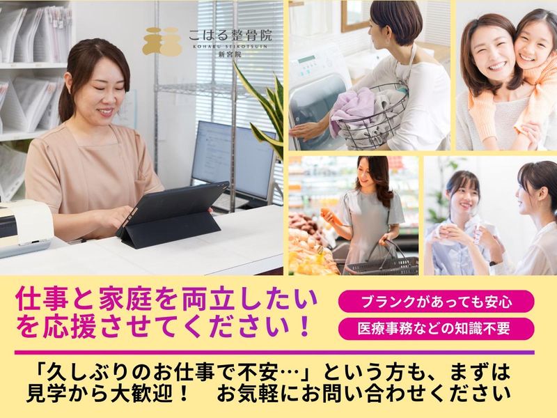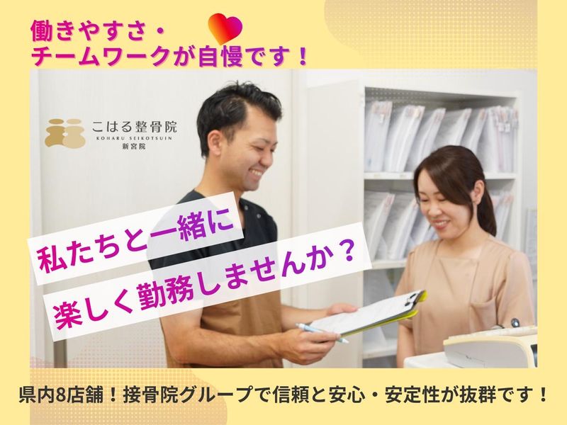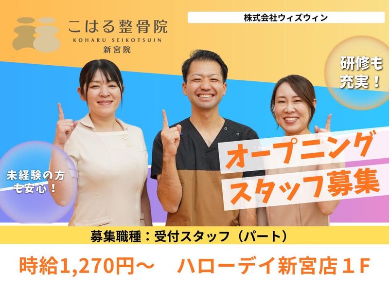仕事内容 🌸3月17日 NEW OPEN🌸 ✨✨こはる整骨院 新宮院 OPEN✨✨ ☆☆新宮ハローデイ1階☆☆ \オープニング受付スタッフ募集/ こはる整骨院 コンセプト 「頑張る女性の毎日に、優しい整骨院を」 ─┘─┘─┘─┘─┘─┘─┘─┘─┘ ▼働きやすいポイント▼ ✅駅チカで通勤ラクラク ハローデイ新宮内にありお買い物も便利 ✅ 時給1270円+報奨金(月3万円実績もあり!)でしっかり収入アップ ✅ Netflix手当あり!プライベートの充実も応援! ✅週2日~OK!これからがんばりたい方にピッタシ ✅未経験から接客・事務スキルが身につきます ─┘─┘─┘─┘─┘─┘─┘─┘─┘ 【業務内容】 2026年3月にオープンする新しい整骨院です。キレイな院内で、患者様をお迎えする受付・ご案内業務をお任せします。明るい挨拶や予約対応、PCを使った簡単な入力業務が中心です。美容や健康に興味がある方にもピッタリの環境です。 <<他にはない、ここで働く魅力 >> 1.「Netflix手当」などユニークな制度が充実 話題の映画やドラマもチェックできる!?スタッフのリフレッシュを大切にする独自の福利厚生があります。 2.頑張った分はしっかり還元!「推し活」資金にも◎ 高時給に加え、業績に応じた報奨金(月3万円支給実績)あり。安定して稼ぎたいフリーターさんにも嬉しい給与体系です。 3.駅チカで通いやすさ抜群 通勤時間が短縮できるので、仕事後のショッピングや友達との予定もスムーズ。日祝休み+長期休暇でオンオフのメリハリもバッチリです。 4.「私らしく」働ける明るい雰囲気 堅苦しいルールはなく、患者様との会話を楽しめる職場です。ネイルや髪型など、清潔感があればおしゃれを楽しみながら働けます。 【サポート体制万全でブランクOK。家庭と両立しながら安心して働けます。】研修とサポート体制が整った安心の職場。ブランクがある方も一から丁寧に学べます。子育て中のスタッフも多く、急なお休みも柔軟に対応。長く安定して働ける環境です。