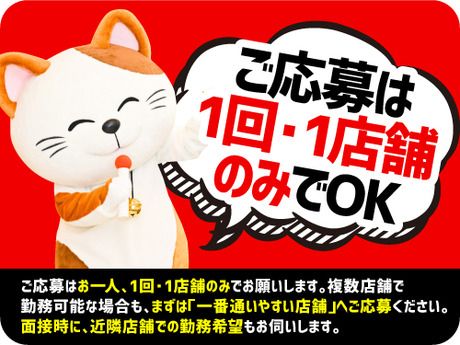 仕事内容 店舗数日本一!まねきねこのメリットその1! <おしゃれOK!自分らしく働ける♪> お客さまが不快な思いをされないことが前提ですが、 明るい笑顔、清潔感のある方なら髪色や髪型は自由! お客さまに食事を提供する業務があるため、 ネイルは単色で装飾なし、 ピアスは片耳に1個ずつとさせていただきます。 <応募&面接も簡単!> 応募時、履歴書不要★ 家でもいつでもできる、 ラクラクスマホ面接実施中! ◆メリットその2! <営業時間が幅広いからシフトはイロイロOK♪> 早朝も昼も夕方も夜間も、都合に合う時間でOK! 週2日~希望相談下さいね! スグ勤務スタートもOK! ★色んな働き方ができる! ◎両立したい大学生の例 「週末限定」「授業後に夕方~」 「試験期間休み」OK! ◎家事育児と両立希望パートさん例 「子どもが家に居ない、朝や昼の時間だけ」 「土日祝休みで平日だけ」 「扶養範囲内」OK! ◎稼ぎたいフリーターさん例 「週5日×ロングのレギュラー勤務」 「高時給の深夜帯メイン」OK! ◎Wワーク例 「本業が休みの日ダケ」 「夜勤専属」 「別のバイト前に午前中のみ」OK! ◆メリットその3! <初バイトや経験に自信がなくても安心スタート♪> フロント/受付/レジ/調理補助/ルーム清掃 ちょっとした洗い場など 簡単な作業から1つずつお任せします。 当店では未経験スタートの先輩が多数活躍中! 「できるかな…」と不安な気持ちもよく分かります。 イチから丁寧に教えますし、 分からない事はスグ聞ける環境なのでご安心を! ◎マニュアル動画をスタッフ専用タブレット端末で チェックすることも可能です! ◆メリットその4! <嬉しい特典多数!昇給ありで時給UP!> ・食事補助あり! ・50%OFF従業員割引あり! ・カタログギフトやミニボーナスが貰える! ★昇給制度…目指せまねきねこ!笑 しろねこ→くろねこ→まねきねこ と、ランクUP&時給UPしていきます! ◆メリットその5! <★雰囲気の良さ100点★> 18歳以上・20代・30代・40代・50代の 色んなスタッフが働いていて楽しい! 皆気さくで新人さんもスグ馴染めますよ♪ 「店長!今月は稼ぎたいです!」 「店長~来月はテスト期間でシフト減らしたい…」 なども自由に相談しちゃって下さい!笑 ▽▽▽▽▽▽▽▽▽▽▽▽▽▽▽▽▽▽▽▽▽▽ ご応募はお一人1回・1店舗のみでお願いします。 複数店舗で勤務可能な場合も、 まずは「一番通いやすい店舗」へご応募ください。 面接時に、近隣店舗での勤務希望もお伺いします。 △△△△△△△△△△△△△△△△△△△△△△