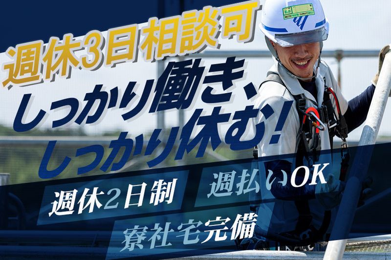 【保険制度】 雇用保険、労災保険、健康保険、厚生年金 【加入保険】 社会保険完備(雇用・労災・健康・厚生年金) 【福利厚生】 昇給あり(随時) 賞与あり(業績及び個人の成果による) 週払い可 前職給与考慮 交通費支給(全額) 各種手当(休日手当・役職手当・残業手当・住宅手当・結婚祝い金・出産祝い金) 寮社宅完備※詳しくはお問い合わせ下さい 男性育児休業制度 社員会 研修あり 資格取得支援 貸与品(作業着/安全靴) 道具貸出 髪型・髪色自由 ピアス・ひげ・タトゥー(見えなければ)OK Wワーク・副業(相談可能) WEB面接OK