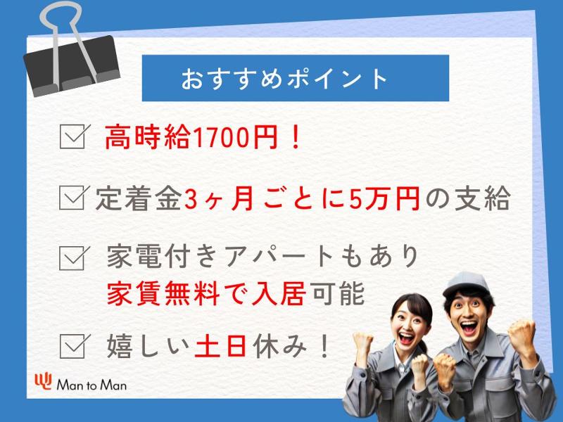 その他: 【応募方法】 1.「応募する!」ボタンからエントリーフォームを入力する 2.フリーダイアル(0120-106-510)に電話する 電話の場合はご希望のお仕事No.を受付時に伝えて頂くとスムーズに進みます 【応募の流れ】 まずはお気軽にWEBまたは電話にて応募してください。 受付担当者よりフリーダイアルからご連絡差し上げます。 明示すべき労働条件の詳細については面談時にお伝え致します。 【面接地】 リモート面接、対面での面接 どちらでも対応しております。 対面面接の場合は最寄りのオフィスに来社して頂くか出張面接も行っています。 【ポイント】 産休・育休取得実績あり,研修あり,U・Iターン歓迎,第二新卒歓迎,交通費支給,寮・社宅あり,学歴不問,社会保険完備,長期休暇あり,社員登用あり,リモート面接OK,主婦・主夫歓迎,⻑期,バイク通勤OK,給料前払いOK,車通勤OK,残業月20時間以内,40代以上も応募可,昇給あり,送迎あり aishin Z02h371501-saiyoo1210全 雇用形態: 派遣社員 給与・報酬: 1,700円 - 2,125円 時給