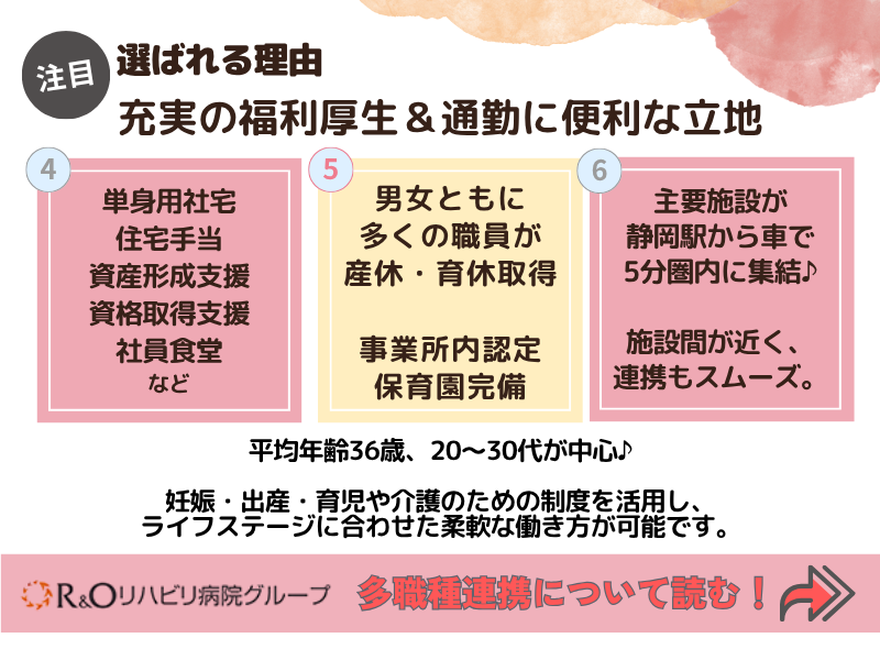 求めている人材 ┏━━━━━━━━━━━━━━━━━━┓ ❖ こんな人と働きたいと思っています! ┗━━━━━━━━━━━━━━━━━━┛ R&Oグループでは、経験や資格よりも 「人と向き合う姿勢」と「支えたい気持ち」を大切にしています。 ❖ 応募資格 ▢ 未経験・資格のない方もOK ▢ 患者さま一人ひとりに寄り添う支援がしたい方 ▢ チームで協力しながら働ける方 ▢ 私たちの理念や価値観に共感し、ともに大切にしてくださる方 ※ 経験年数・ブランク不問 ※ 医療・介護の仕事が初めての方も歓迎 ❖ 歓迎要件 ▢ 病院・施設などでの介護・看護補助経験がある方 ▢ 介護職員初任者研修・実務者研修修了者 ▢ 介護福祉士資格をお持ちの方 ▢ 将来的に介護福祉士・ケアマネージャーなどを目指したい方 ┏━━━━━━━━━┓ ❖ 活躍できる人物像 ┗━━━━━━━━━┛ \◇ こんな方に向いています / ・患者さま・利用者さまとじっくり向き合いたい方 ・人の役に立つ仕事がしたい方 ・チームで連携しながら働きたい方 ・医療や介護の仕事に興味がある方 ・ゆとりを持って丁寧に働きたい方 ・子育てと仕事を両立させたい方 ・将来的に介護福祉士などの資格取得を目指したい方 ┏━━━━━━━━━━━━┓ ❖ 配属の可能性がある施設 ┗━━━━━━━━━━━━┛ 勤務は以下いずれかの施設となります。 配属はご本人の希望や適性を踏まえて決定しています。 ▢ 静清リハビリテーション病院 〒420-0823 静岡県静岡市葵区春日2丁目12-25 └ JR東海道線 静岡駅よりタクシーにて約5分 └ 東静岡駅よりタクシーにて約3分 └ 静岡鉄道 春日町駅より徒歩3分 └ 静鉄バス 下横田バス停下車 徒歩3分 ▢ しずおか整形外科病院 〒420-0821 静岡県静岡市葵区柚木90番地の1 └ JR東海道線 静岡駅よりタクシーにて約5分 └ 東静岡駅よりタクシーにて約3分 └ 静岡鉄道 柚木駅より徒歩4分、春日町駅より徒歩6分 └ 静鉄バス 下横田バス停下車 徒歩5分 □━━━━━━━━━━━━━□ ┏━━━━━━━━┓ ❖ 私たちの価値観 ┗━━━━━━━━┛ ╭━━━╮ ❶ 理念 ╰━v━╯ 「生きるげんき、リハビリで。」 私たちは、身体機能の回復だけでなく、 その人らしい生活の再建を大切にしています。 回復を「点」ではなく「線」で捉え、 治療のその先の生活まで支える医療・介護を実践しています。 ╭━━━━━━╮ ❷ チーム医療 ╰━v━━━━╯ 職種同士が専門性を尊重し、情報を共有し、 すべては患者さまのために行動する。 全職種がスクラムを組む、 “ラグビー型”チーム医療を実践しています。 ╭━━━━━━━━━━━━╮ ❸ 地域とともに生きる医療 ╰━v━━━━━━━━━━╯ 医療は、病院の中だけで完結しません。 静岡という“地域そのものの健康”を支える存在でありたいと考えています。 プロスポーツチームのメディカル支援、ケガ予防活動、市民公開講座、 地域包括支援センターと連携した運動支援など、地域の健康づくりに直接関わっています。 また地域イベントへの協力など、医療の枠を越えた支援も行っています。 効率的な運営で得た力を 「職員」だけでなく「地域」にも還元する。 R&Oで働くことは—— ✨ 自分の仕事が地域の役に立っている実感 ✨ 家族にも誇れる職場であること につながっています。 医療を通じて、人を支え、地域を支える。 それも私たちの大切な価値観です。 ┏━━━━━━━━━━━━┓ ❖ なぜ若い世代が多いのか ┗━━━━━━━━━━━━┛ R&Oには、20〜30代の職員が多く在籍しています。 それは“若手が定着できる仕組み”があるからです。 養成機関に通う学生が利用できる奨学金制度など、 「将来の不安を減らす制度設計」がその一つ。 そして制度だけでなく、職場の雰囲気の良さも理由です。 職種を超えて相談しやすく、協力し合う風土があり、 人間関係の良さも、長く働くスタッフが多い理由の一つになっています。 ・平均年齢36歳、20~30代が中心 ・男女バランス良く在籍(女性62%・男性38%) ・明るく、相談しやすい職場環境 ・年齢や年功序列ではなく、意欲ある人に仕事を任せる風土 若手を消耗させるのではなく、長く育てる前提の組織です。 ** ┈┈┈┈┈┈** ➽ 医療法人社団アールアンドオーについてもっと知りたい方へ ホームページをぜひご覧ください。 \長押ししてWEB検索!/ https://www.r-and-o.jp/ \SNSでも活動などを公開中/ Instagram:https://www.instagram.com/r_and_o_/ X:https://x.com/R_and_O_Rehab Facebook:https://www.facebook.com/RandOgroup/ YouTube:https://www.youtube.com/@randosaiyo ** ┈┈┈┈┈┈**