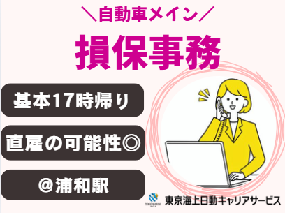 仕事の内容 \自動車の継続処理メイン/ ◆基本17時帰り ◆チーム制でフォロー体制◎ ◆勤務評価次第で直接雇用の可能性有 @浦和駅 【基本情報】 雇用形態:派遣社員 雇用期間:長期(3カ月以上) └5月~開始日相談可能 就業時間:9:00~17:00(休憩60分) ∟残業少なめ 【必須条件】 ◆損保事務のご経験がある方 ◆パソコン:基本操作(入力~修正) 【お仕事内容】 自動車保険の継続処理がメイン業務 ・照会応答 ・見積作成 ・計上 など 〔種目〕自動車、火災、傷害 【環境面等】 @浦和駅エリアにある官公庁系専門の代理店 └官公庁が多くあるエリアにあり、飲食店やコンビニ多数! ・30代・40代・50代の多い職場 └平均年齢40代後半/男性5:女性9 └困ったときはチームでサポート!派遣スタッフ活躍中 ・穏やかで落ち着いた雰囲気 ・お弁当持参OKです ・オフィスカジュアル内で服装自由 └更衣室完備 【福利厚生等】 ・社会保険完備 ・ベネフィット・ステーション ・定期健康診断あり ・禁煙オフィス!煙苦手な方も安心 ・平日のみOK!土日祝休み ・年間休日120日以上&お休み相談可 └有給休暇 ○●ご応募検討中の方へ●○ チームで協力してお仕事を進めている職場でフォロー体制◎ 安心してご勤務いただける環境でムリなく働きたい方にぴったりのオシゴトです! 少しでも気になった方は、ぜひお気軽にご応募ください♪ ○●嬉しいPOINTたくさん!●○ 履歴書不要!開始日相談/長期/主婦・主夫活躍中/子育てに理解のある職場/ブランクOK/社員に相談できる/資格取得支援/残業月5時間以内/17時退社/社員登用あり