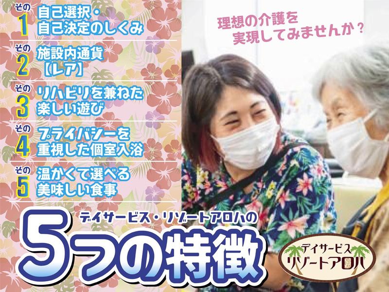 仕事内容 <リゾートアロハとは︖> ・スタッフ全員アロハシャツを着て勤務!? ・お客様が「稼いで」「貯めて」 「使える」施設内通貨がアリ! ・施設内にはパチンコ台・レッドコートを設置! 今日という大切な1日をどう過ごすか? 選んで決めるのはお客様自身です。 ★施設の都合よりもお客様の意思が最優先!★ お食事もリハビリも遊びもお風呂も…他にもいろいろ。 何もしない…それもOK。 お客様が選択をすることに対して サポートすることが私たちの仕事です。 皆さまがイメージしている介護施設とは ちょっと違うかもしれません。 一度フラッと覗きに来てください。 スタッフみんなお待ちしています。 =========== 未経験スタートOK★ 週1日~の勤務でOK◎ Wワーク・副業も可能! =========== 普通車もしくはミニバンを運転して 施設から利用者様宅へ送迎をします。 大体の走るルートは決まっているので 毎日新しいルートを覚える必要はナシ! 4名~5名の利用者様を送迎するので 片道1時間半くらいで送迎できます。 1人で歩行できる利用者様が多いので、 乗り降りの際のサポートだけでOK! <シフトの決め方> 働き方は自由!希望に応じます。 「平日だけ」「土曜だけ」 「週5日でガッツリ」 「Wワークだから週1日」 など…OK! <Wワーク・副業もOK!> 朝送迎してから他の職場で働いて 夕方送迎する働き方も可能ですよ♪ <スタッフの声:中高年スタッフ> 送迎ドライバー(送迎運転手・送りドライバー)、 送迎バス運転手(バスドライバー・マイクロバス運転手)、 介護送迎ドライバー、幼稚園バス運転手、役員運転手など、 運転手ドライバー系の仕事で幅広く探していた時に 出会ったのがこの職場でした。 正社員・アルバイト・パート問わず気軽に話せる和やかな雰囲気で、 シニアに近い年齢の私でも無理なく仕事ができています。 シフトの融通が利くのも働きやすいポイントです♪