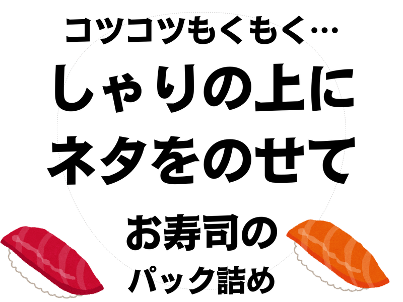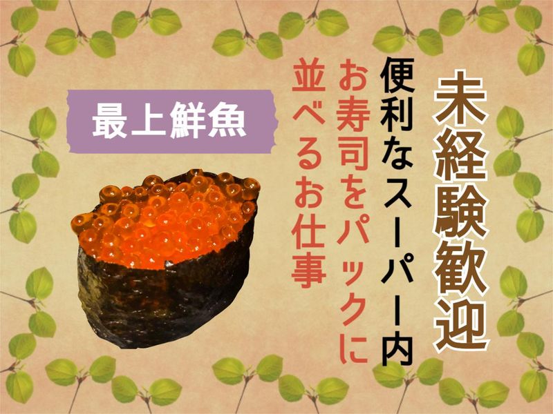 仕事内容 スーパー内にて、食品のパック詰めなどコツコツもくもく作業をお願いします。 かんたん作業がメインなので、初めての方もブランクがある方も大丈夫ですよ。 お刺身やおすし・惣菜などのパック詰め、シール貼り、陳列作業などをお任せしていきます。 ほとんどのスタッフが未経験からスタートしていますのでご安心くださいね。