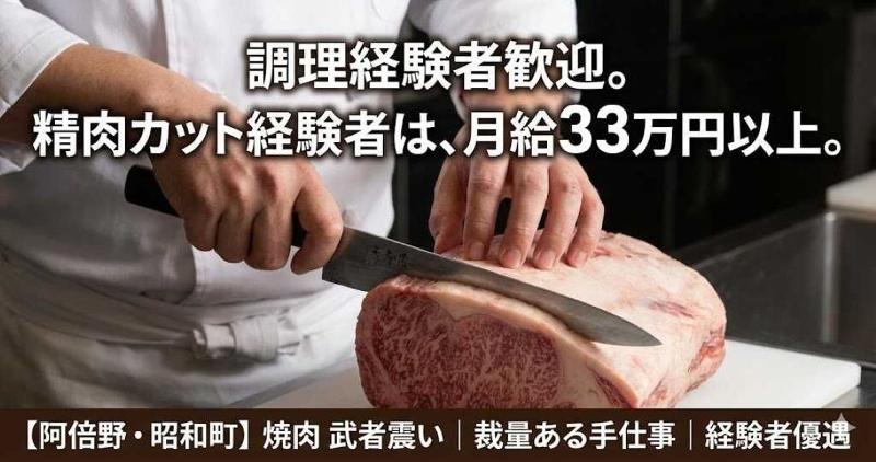 【15時始業×調理技術を活かす】阿倍野・昭和町で愛されて間もなく3年。 上質な和牛と技術で評判の「武者震い」は、スタッフのゆとりを大切にする店です。ランチなしの15時出勤だから、午前中は完全自由。専用スクーター貸与など、深夜の帰宅まで配慮を惜しみません。あなたの調理経験をここで活かしませんか?