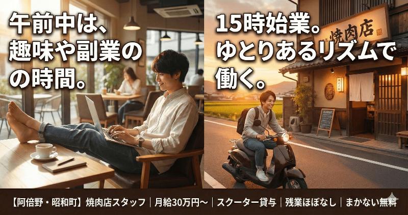 【焼肉店正社員】阿倍野・昭和町/調理経験者優遇/15時始業/スクーター貸与・バイク通勤可