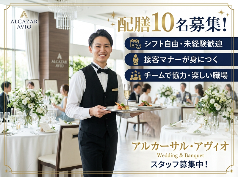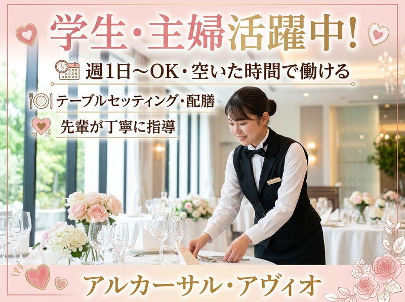 仕事内容 ⭐千早駅徒歩30秒⭐月1回~OK✨学生・主婦活躍中❗ 結婚式場で楽しく働くバンケットスタッフ10名募集 【10名採用予定✨今が応募のチャンス❗】 千早駅から徒歩30秒の結婚式場で、披露宴やパーティーを支えるバンケットスタッフを募集します。 月1回~OK、学生さん・主婦(夫)さん・フリーターさん歓迎⭐ 「毎週は難しいけど働きたい」「学校や家庭と両立したい」「接客マナーを身につけたい」そんな方にもぴったりです。 未経験から始めたスタッフも多数活躍中✨ 堅苦しい職場ではなく、みんなで協力しながら楽しく働ける雰囲気が魅力です。 千早駅徒歩30秒の結婚式場「アルカーサル・アヴィオ」にて、 披露宴やパーティー会場でのバンケット(サービス)スタッフのお仕事です✨ 結婚式や宴会をスムーズに進めるためのサポート業務をお願いします。 未経験の方でも始めやすいお仕事なので安心してスタートできます⭐ 【⭐主なお仕事内容⭐】 ⏩料理やドリンクの配膳 ⏩テーブルセッティング・会場準備 ⏩披露宴・宴会終了後の片付け ⏩会場内のサポート業務 ⏩ゲストのご案内や誘導 最初は先輩スタッフが一緒に動きながら教えていくので、 未経験の方やバイトデビューの方も安心です❗ 結婚式という特別な一日を裏側から支える、 やりがいのあるお仕事です✨ 【⭐アピールポイント⭐】 ⭐ 千早駅徒歩30秒の超駅チカ 駅のすぐ近くなので通勤ラクラク! 学校帰りや買い物ついでにも働きやすい立地です。 ✅ シフト自由!月1回~勤務OK 毎週入れなくてもOK! 学校・家庭・Wワークなど、予定に合わせて無理なく働けます。 ✨ 未経験スタート大歓迎 難しい仕事はありません。 先輩スタッフが丁寧に教えるので、バイトデビューの方も安心です。 ⏩ 学生・主婦(夫)・フリーター歓迎 幅広い年代のスタッフが活躍中。 空いた時間を活かして働けるお仕事です。 ⭐ 接客マナーが自然と身につく 言葉づかいや立ち振る舞いなど、将来にも役立つスキルが学べます。 ❗ 10名採用予定の今がチャンス 今回は増員募集のため、採用枠も多め。 同期もできやすく、安心してスタートできます。