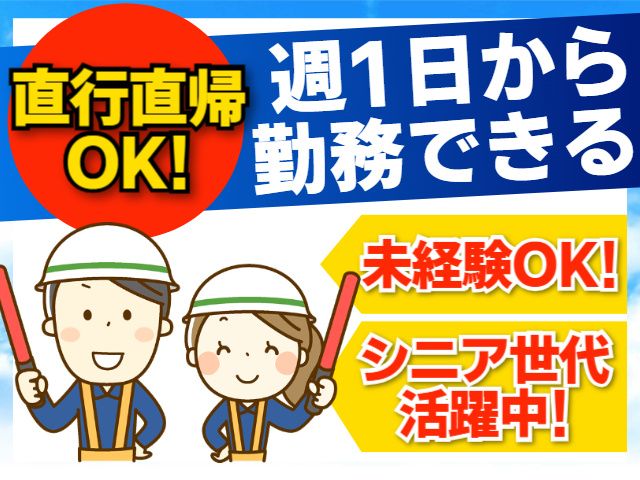 仕事内容 【警備スタッフ大募集!】 イベント会場や工事現場などでの交通誘導警備をお願いします。 その他、雑踏・駐車場警備など様々な警備のお仕事があります! 勤務日数相談OKなのでWワークも可能! 働くスタイルはお気軽にご相談ください。 日勤専属、夜勤専属などもOK! 【勤務地について】 警備の種類によって勤務地も色々あります。 現場には直行直帰できますので、時間を有効に使えます。 【お仕事について】 ・交通誘警備 ・現場は工事現場やイベント会場など 歩行者や車両など事故がおこならないように気を付けながら誘導してもらいます。 雑踏警備や駐車場警備などもあります! 幅広い警備のお仕事がありますので、お気軽にお問合せ下さい! 【幅広い年齢層の方が在籍】 50代からのミドル・中高年・シニア世代の男女が活躍中! 【未経験の方もOK】 採用後に最低4日間の研修があるので、警備員未経験でも安心して働けます。 初めての現場デビューの際は、先輩警備員や指導者と共に業務にあたります。 【勤務時間相談OK】 日勤専属、夜勤専属などもお気軽にご相談ください。 【オススメポイント】 ・日中・夜間のお仕事 ・短時間勤務OK (午前のみ、深夜、夜間など) ・土日のみ、平日のみの勤務OK ・扶養内勤務OK ・WワークOK ・制服貸与 ・研修制度あり ・警備員未経験OK ・50代以上の男女活躍中! ・勤務日数相談OK ・正社員登用制度あり 無理せず働きたい方も、正社員を目指して頑張りたい方も警備に興味がある方はぜひご応募ください!