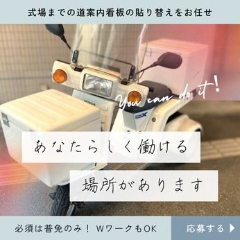 仕事内容 道案内看板の貼り替えのお仕事をお任せします 車や最寄り駅から歩いてご来場される お客様に向けた、式場までの道案内看板 の貼り替えをお任せします。 ※要普通免許/三輪バイク使用。 *先輩が一緒に行動しながら 仕事を教えますので未経験の方も心配無用です。 設置場所は固定なのでルートを覚えればあとはカンタンですよ。 <<1ヶ月毎のシフト制なので予定や都合も考慮可能>> ・希望考慮のシフトでプライベートと両立した勤務が可能です。 ・フルタイムのフリーターさんなど、 若手~40代・50代の方まで、幅広い年代の方が活躍中! ・フルタイムで働ける方大歓迎! 社会保険完備なので、安定して長期勤務が可能です。 <<副業として・WワークもOK>> ご家庭が忙しい方や今の収入を増やしたい方なども 大歓迎!WワークOKなので副業として働きやすい♪