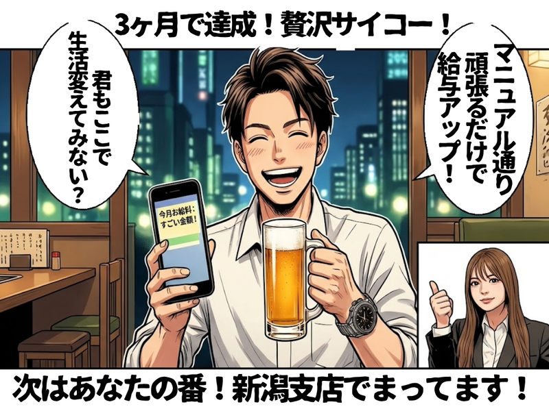 求めている人材 ●経験・年齢・学歴不問 ●業界未経験・資格不問 ●既卒・第二新卒・新卒歓迎 ●ブランク・UIターン歓迎 ●人と話すことが好きな方 ●ガッツリ稼ぎたい方 ●20〜30代の若手活躍中 ●営業経験者は即戦力! ●体育会系の出身者も多数! ●コスパ・タイパ重視の方 「とにかく稼ぎたい!」 そんな理由でOKです。 正当な評価がされない悩み、 当社で解決しませんか? 「結婚・マイホーム・起業」 あなたの夢を会社が全力で サポートします! 【当社でやれば】稼げます! 《 働くスタッフは… 》 長岡・燕市エリアがメイン。 車で10〜50分圏内です。 ◆MBTI診断例 ENFJ、INTP、ENTJ等