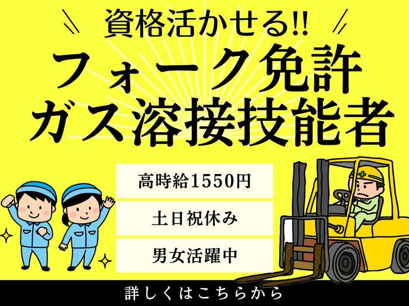 仕事内容 ✦・┈┈┈┈┈ ・✦✦・┈┈┈┈┈ ・✦ ⭐応募は履歴書不要& スマホから簡単登録可能♪ 「残業少なめ」「土日祝日休み」 「高時給1550円」で 安定のワークライフバランスを実現! ⭐フォークリフト免許、 ガス溶接技能者の資格をお持ちの方 ※実務経験のある方限定募集 ✨パソコンスキルは問いません! ✨20代・30代を中心に活躍中! ✦・┈┈┈┈┈ ・✦✦・┈┈┈┈┈ ・✦ ┏━━━━━━━┓ ⭐人気のPOINT⭐ ┗━━━━━━━┛ ✅20代・30代活躍中の職場です! 若手スタッフ多数在籍◎ ✅経験者歓迎!ブランクOK! ✅同じ作業をしている仲間が約20名! 男女ともに在籍している企業です! 困った時、不明点の相談もしやすい♪ ✅安心の完全週休2日制! 残業もほとんどなく、お家時間も充実! 「行きたいイベントがある!」 「ちょっと遠征してフェス行ってきます」 なんて、趣味も満喫できる環境です♪ ✅上下作業着貸与&シャワー室あり お仕事終わりにさっぱりしてから 帰れるのでスタッフからも大好評! 近所にはスーパー銭湯や テーマパークもあって利便性抜群◎ ✦・┈┈┈┈┈ ・✦✦・┈┈┈┈┈ ・✦ ꒰꒰ 免許を活かして働こう ꒱꒱ レアメタルなど再生資源の回収や 加工・販売を行っている 優良企業で長期安定勤務✨ ❁工場内での加工作業 └金属スクラップの溶断 (金属裁断機を使って溶解) ❁フォークリフトでの運搬 など、手順が明確だから ブランクのある方も 安心してスタートできる環境です! ☕ガス溶接技能者資格、 実務での経験が活かせます! ☕パソコンスキルは不問! ꒰꒰ ご応募は電話からも ꒱꒱ ꒰꒰ 受け付けています! ꒱꒱ ⏩TEL:0120-343-222 上記の番号にご応募いただければ、 その場で面談日も決めさせていただきます! スピーディにお仕事を決めたい方はぜひ♫ ✦・┈┈┈┈┈ ・✦✦・┈┈┈┈┈ ・✦ ┏━━━━━━━━━━━━┓ ⭐ 安定で選ぶならKOSMO⭐ ┗━━━━━━━━━━━━┛ ✨35年以上の歴史があり安定✨ KOSMOは、労働者派遣法が 施行された1986年から続く 人材サービスを手掛ける会社なので 安定して働きたい方にピッタリ! 入社して15年目になるスタッフも◎ ✨多数の案件あり!大手勤務も叶う✨ 長きにわたってクライアントの 人材に関する課題を解決してきた 実績・信頼があるため 大手クライアントが多く、案件が多数! ニーズの高まりから、業績も好調です。 ┏━━━━━━━━━━━━━━┓ ⭐ご入社後のサポートについて⭐ ┗━━━━━━━━━━━━━━┛ ご入社後は、担当の営業スタッフが あなたの就業をしっかりサポート! 実際の職場では分からないこと、 困ったことがあれば いつでも先輩スタッフに聞ける環境です! ✦・┈┈┈┈┈ ・✦✦・┈┈┈┈┈ ・✦