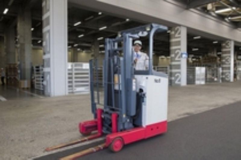 日用品のリーチフォークリフト運搬作業