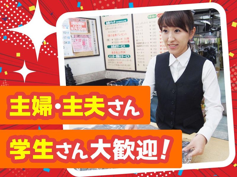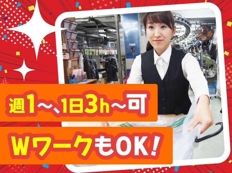 仕事内容 / ⭐(*´ω`)<難しい作業なし! クリーニング店の受付スタッフ⭐ お客様からの「ありがとう」に やりがいを感じます! \ 【仕事内容は難しくありません♪】――― ✅クリーニングする洋服の受付 お預かりした服の汚れや傷などを確認し 洗い方や仕上げ方、有料のしみ抜きの 有無等アドバイスがメイン♪ ✅検品、お渡し、タグ付けなどの軽作業 クリーニングが終わった服をお客様の 来店時に伝票と交換します。 …………………………………………………… 【こんな方なら大歓迎!】 ◎「清潔第一!」それができていればOK! ◎友達同士の応募も可能! ◎受付といっても難しいことはありません。 接客の経験があれば尚可ですが丁寧に指導 しますので未経験の方でも大丈夫です。 ◎週2日・1日6時間~OK!Wワークも可能 なので働きやすい時間をご相談ください。 ◎空いた時間を有効活用したい主婦(夫)さん や学生さん、しっかり働いて稼ぎたいと いうフリーターさんも大歓迎! ◎交通費支給★アルバイトからの社員登用 制度あり!で嬉しいメリットいっぱい! ◎嬉しい従業員割引でお得にクリーニング が出来ちゃいます☆彡 *――――――――――――――――――*