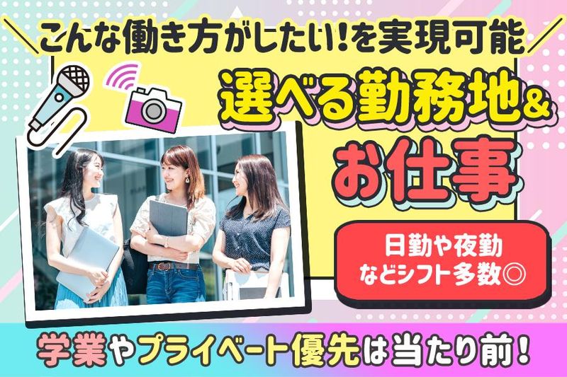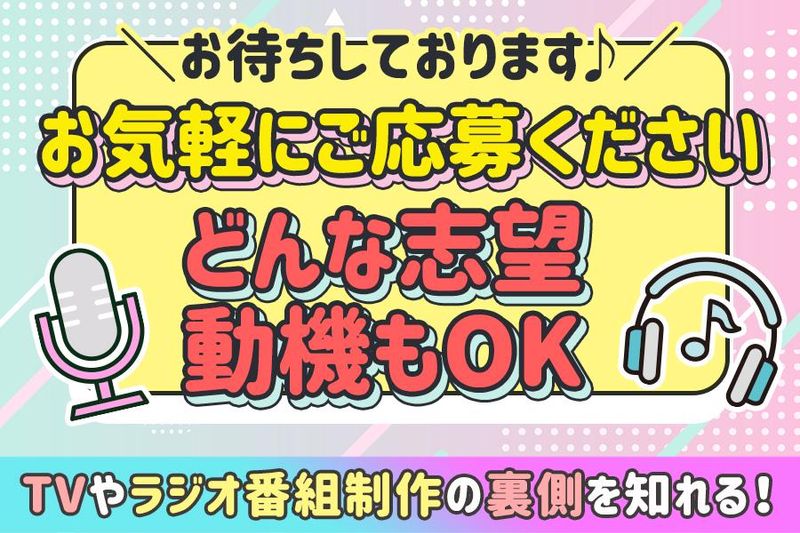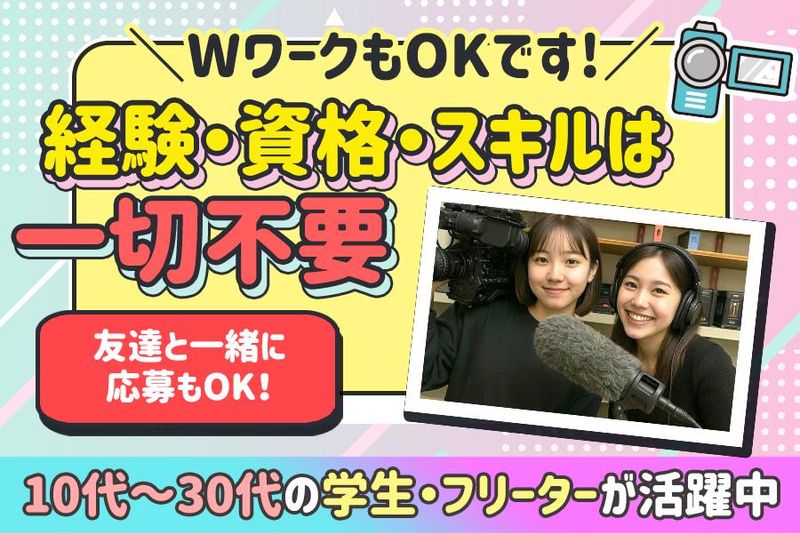 仕事内容 \レア求人!テレビ局でアルバイト!/ 一度はみたことがある”あの番組”を <裏方>としてサポートしてみませんか? 普段は入ることはできないテレビ局内で お仕事することができますよ★ 適度に体を動かしつつ 番組作りのサポートをお願いします♪ ●大量募集につき採用率UP中! ●大学生・フリーターさん多数活躍中! ●経験・スキルは一切不要! …………………………………………… Q『テレビ局での仕事って何?』 テレビ局内の裏方のお仕事は多種多様! 様々な役割ごとにお仕事があります◎ 「こんな仕事してみたい!」 「将来役に立ちそう!」 「面白そう!」 など あなたが興味を持ったお仕事を お任せします! …………………………………………… < 具体的なお仕事内容 > ■動画編集 ・ニュース番組に関わる編集業務 ■映像素材の素材取り込み ・素材の取り込み作業 ■ADサポートスタッフ ・資料配布や文字起こし ・ニュースの原稿の確認 ・ゲストさんのお迎え など などなど! 未経験者さんが活躍できる ”かんたん業務のみ”をお任せします! 専門的な知識は一切必要ありません! 最初からできないのは当たり前! 仕事は少しずつ 覚えて貰えていただけたら大丈夫です◎ ……………………………………………… < アピールポイント > ✅大学生が多数活躍中!就活で活かせます ✅週1日~OK ✅学業・プライベート優先でOK ✅勤務地の選択OK!駅チカでアクセス良好 ✅髪色自由で自由度高め ✅研修しっかりあります ✅将来、マスコミやメディア業界に進みたい方は 役に立ちます! ……………………………………………… < 志望動機はなんでもOK! > 実際に皆さんの志望動機は・・・ 「テレビ局の裏側を知りたい!」 「面白そう!」 「友達とバイトできそうだったから」 「就職活動に使えそうだから」 「週1日~OKに惹かれたから」 など、応募理由もそれぞれ! まずは話を聞くだけもOKなので 面接時にお気軽にご相談ください♪ 友達と一緒に応募も大歓迎ですよ◎