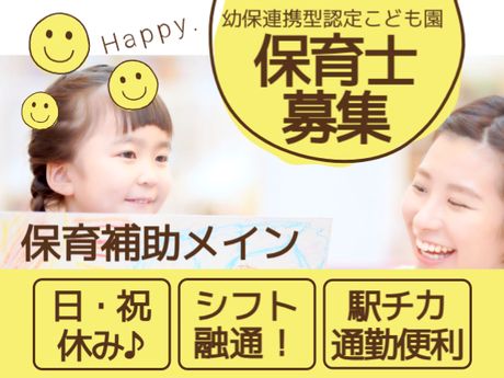 仕事内容 ■認定こども園における保育補助業務全般 ※副担任やフリーなど、クラス担任保育士の保育補助のお仕事をお願いします ※慣れてきたら連絡帳や日誌などの書き物をお願いする場合あり ※ピアノは弾けなくても大丈夫! <主な業務> ・遊びの見守り ・オムツ交換、排泄介助 ・着替えのサポート ・給食・おやつの配膳や補助 ・保育補助業務、フリー業務 ・午睡チェック ・保護者の方へ一日の様子のお伝え ・その他保育に付随する業務 など 《1日の過ごし方》 07:30~ 順次登園 09:00~ 朝礼、設定保育(外遊び・散歩) 12:00~ 給食 15:00~ お昼寝、自由遊び、おやつ 16:00~ 順次降園 ~20:00 閉園 <派遣先> 【就業場所】 定員75名幼保連携型認定こども園 <通勤方法・その他補足> ※自転車通勤OK <受動喫煙対策> あり(敷地内禁煙) ここがポイント ■高時給1400円!月収23万円以上可能 ■日勤帯のみ実働8時間の勤務です ■定員75名の幼保連携型認定こども園です ■副担任やフリーなど、クラス担任の保育補助のお仕事をお願いします ■「早番のみ」「遅番のみ」など働き方ご相談ください ■お仕事に慣れてきたら連絡帳や日誌などの書き物をお願いする場合があります ■ピアノは弾けなくても大丈夫! ■日曜日、祝日はお休みです ■最寄駅より徒歩7分