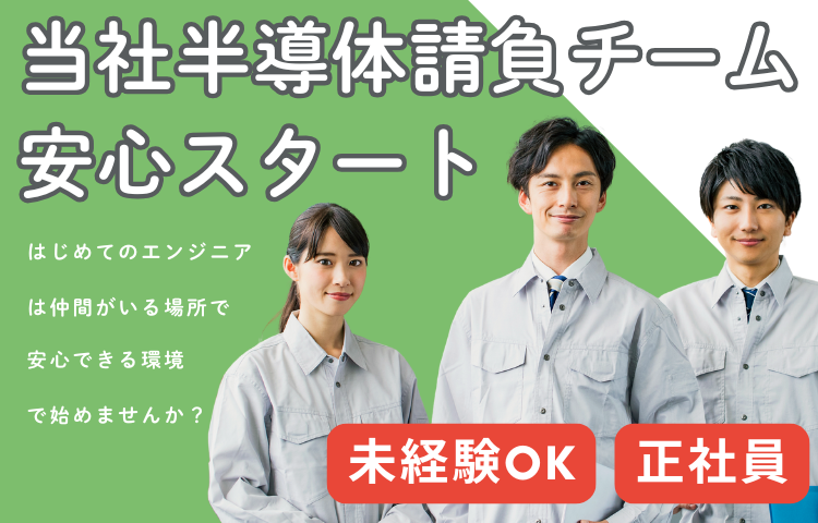 職場環境 ★当社エンジニアによる請負チームでのお仕事です。 ★教育体制が充実しており、未経験でも安心して働けます。 ★マネージャーやリーダーになるチャンスも豊富にあります。 新しい綺麗な研究棟のクリーンルームで、夏も冬も快適な環境です。 喫煙所:喫煙所あり(屋内) 受動喫煙対策:有(喫煙室設置)※配属先により異なる