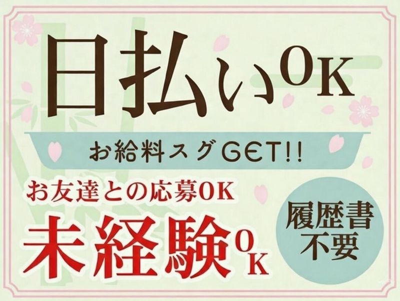 仕事内容 …⌒… …⌒… …⌒… …⌒… …⌒… \環境美化を広めよう/ 京都・嵐山 クリーンアップイベント開催 3/20(金祝)・21(土)の2日間限定 …⌒… …⌒… …⌒… …⌒… …⌒… 渡月橋や竹林の道 紅葉の名所・大覚寺や常寂光寺 季節限定で特別公開される宝厳院― 数々の観光スポットが集結する 京都・嵐山エリアで 環境美化への関心を高めるための クリーンアップイベントが開催されます 歴史深い嵐山の 数々の建物や自然を通じ 環境を美しく保つことの 大切さを知ってもらう― そんな2日間限定イベントを 盛り上げてくれる方の募集です ◆具体的には  ̄ ̄ ̄ ̄ ̄ ̄ 3/20(金祝)・21(土)の2日間限定! 嵐山エリアで行われる クリーンアップイベントでのお仕事です ・お客様の案内や誘導、受付 ・ゴミ袋配布 ・コンテンツ運営 など イベント運営全般の補助業務をお任せします ◎難しい作業はないので イベント未経験の方も大歓迎 ◎京都や歴史が好きな方にもオススメ! ◆POINT  ̄ ̄ ̄ ̄ ◇日払いOK ◇交通費(エリア手当)支給 ◇お友だちと一緒に勤務も大歓迎 お気軽にお問い合わせ下さい◎ ――――――――――――――――――― < 履歴書不要 > 履歴書不要で登録OK♪ 登録会も毎日開催しています◎ 即日勤務を希望の方も お気軽にご相談下さいね☆ ――――――――――――――――――― < 当社を少しだけご紹介 > あらゆる角度で イベント現場をサポート! ・イベント ・キャンペーン ・展示会 ・セミナー などの 企画制作や運営業務から ・各種イベント事務局運営 ・キャスティング業務 まで イベント関連の 幅広い業務を行う企業です!
