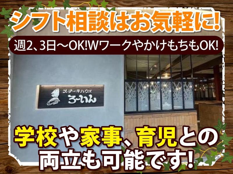 求めている人材 ◎未経験ok! ◎経験者歓迎! ◎ブランクOK! ◎初バイト歓迎! ◎大学生活躍中! ◎フリーター活躍中! ◎シニア活躍中! ◎高校生も活躍中! ◎WワークOK! ◎かけもちOK! ◎副業での勤務OK! ◎子育てが落ち着いた40代・50代・60代の主婦さん活躍中です! =================== ◎SNSの発信や編集が好きな方、得意な方大募集! インスタやTikTokなどお店のSNSにも力を入れていきたいと考えています。 あなたの得意を活かしてみませんか! ◎インスタ⇒「steak_house_roin」「ro.in.1982」で検索下さい! ◎TikTok⇒「roin_.steak」で検索下さい!