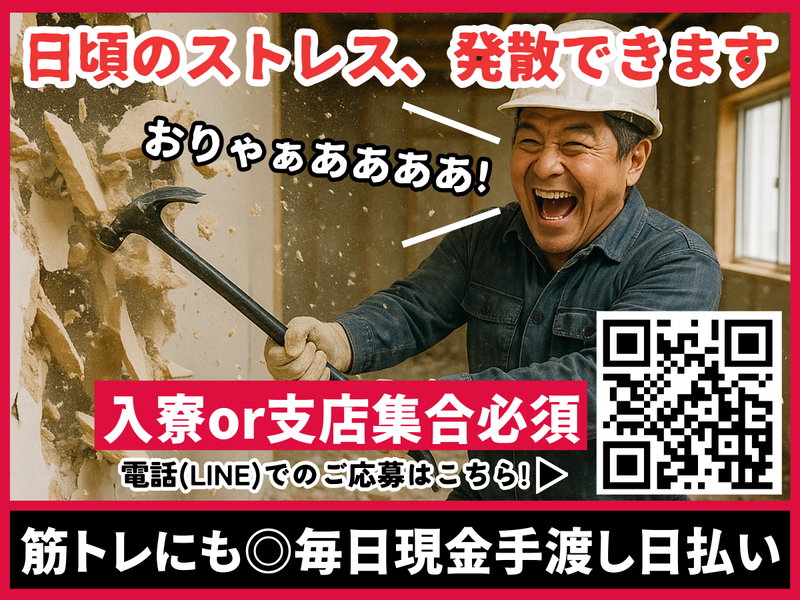 求めている人材 <必須> ✅建設作業の経験がある方 ◆学歴不問! 中卒、高卒…何でもOK! ◆転職回数なども不問! 過去のことは関係ナシ ✅運転免許保持者大歓迎 運転1回1000円支給! <こんな方も歓迎> ■友人宅にずっと居候しているけど、 そろそろ住み込みの仕事探さなきゃ… ■今すぐ働ける場所ないかなぁ… ■明日の寝床、食事どうしようかなぁ… ■とりあえず明日生きていくための お金がほしいなぁ…