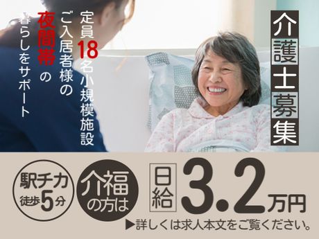 \日給3万円以上の夜勤/定員18名★小規模施設|週2回~相談OK|勤務ユニット固定|駅チカ徒歩5分!交通費全額支給◎