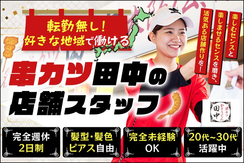 アピールポイント: ----------------------------------- 串カツ田中の働きやすさ! ----------------------------------- ◆安心の人員体制 1店舗に正社員が2~5名おり、 複数の社員で交代が可能! だから週休2日制で有休を調整できます! ◆楽しい社内イベントも盛りだくさん! 串カツ検定や社員旅行、運動会など 店舗の垣根を越えた交流もたくさん! 上司や経営陣との距離も縮まるから、 数値感覚や店舗運営の理解も自然と深まります。 ◆ チャレンジが歓迎される文化 店舗の改善提案など、 役職・社歴に関係なく アイディアを発信できる社風。 アルバイトのアイディアが採用されることも◎ ◆キャリアアップしやすい会社 串カツ田中では 半期ごとに評価×面談を実施し、 小さな成長も見逃さず給与・賞与に反映します。 年齢や学歴ではなく あなたの努力と結果をしっかり評価します!