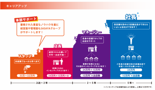 月給300,000円以上 給与詳細 ※基本給・固定残業代・一律手当の総額 基本給:月給 20万3700円 〜 固定残業代:あり 1ヶ月あたり7万5100円 〜(固定残業時間:1ヶ月あたり51時間) 固定残業時間を超えた勤務時間については別途残業代を支給する 【一律手当】 全員に一律で支払われる通勤・皆勤・家族手当金額:なし 全員に一律で支払われるその他手当金額:あり 1ヶ月あたり2万1200円 *経験・スキルに応じて決定 *深夜手当を含む 【給与例】 給与例 【年収例】 ・入社3年目/28歳:年収500万円 ・入社3年目/29歳:年収624万円 ・入社3年目/32歳:年収750万円 ・入社5年目/35歳:年収1000万円(複数店舗を経営)