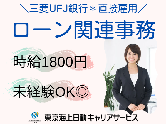 仕事の内容 株式会社三菱UFJ銀行での銀行のローン関連業務(審査補助や各種照会対応など)になります。 なお本求人は職業紹介事業者である株式会社東京海上日動キャリアサービスによる紹介案件です。 安定して長期で就業したい方、コミュニケーションスキルを活かしたい方、30代・40代からも長期で活躍できる職場です。 【お仕事内容】 ローン関連業務のお仕事 ・各種ローン申込書の受付事務処理 ・書類確認、審査補助及びそれぞれに付随する業務 ・各種照会対応 ・伝票起票、帳票整理、端末操作等 ・営業補助事務 【環境面等】 ・30代・40代・50代の多い職場 └幅広い年代活躍中 └わからないことは質問、確認をしながらオシゴトできる環境です ・静かで落ち着いた雰囲気 ・制服貸与 ・転勤なし ■開始日:毎月第1営業日 └ご勤務中の方も応募カンゲイ ■ご応募いただいた勤務地の希望に添えない可能性あり └採用状況により他支店になる可能性がございます ■家庭やプライベートとの両立も◎“自分らしい働き方”を始めてみませんか? 少しでも気になった方は、ぜひお気軽にご応募ください♪ ○●嬉しいPOINTたくさん!●○ 転勤なし/U・Iターン歓迎/子育てに理解のある職場/未経験OK/ブランクOK/交通費全額支給