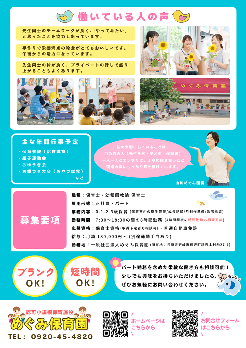 求めている人材 経験年数は問いません。 子どもたちの「笑顔」と「ありがとう」を 大切にできる方をお待ちしています。 【必須条件 (MUST)】 ・保育士資格をお持ちの方 【歓迎条件 (WANT)】 ・子ども一人ひとりに寄り添った保育がしたい方 ・アットホームな職場で働きたい方 ・壱岐市の自然の中でのびのび働きたい方 ・ブランクがあるけれど復帰したい方 ・子育て経験を活かしたい方