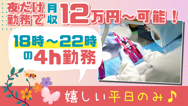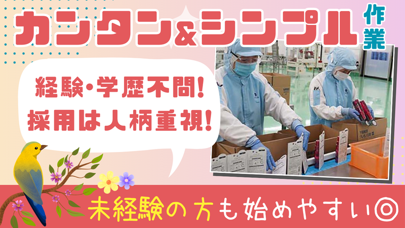 仕事内容 \3月2日~4月30日までの短期募集/ カンタン&シンプル作業メインだから 未経験でも始められる! 「短期間で効率よく稼ぎたい!」 「夕方からの時間を有効活用したい」 という方にオススメのお仕事です。 約2ヶ月間の短期×高時給 1日4時間の短時間勤務で、 無理なく安定収入が目指せます◎ 朝起きるのが苦手な人にも ピッタリですよ★ ✅平日のみの勤務(土日祝休み) ✅夕方からの勤務で日中は自由! ✅短時間でも月収12万円以上可能! ~~~~~~~~~~~~~~~~~~ 【具体的な仕事内容】 化粧品などの製造補助や梱包をお任せ! ・容器の取り出し ・ノズルやキャップの取付け ・箱詰め作業 など エアゾール製品・液詰製品の梱包が中心の 製造ライン作業です。 ~~~~~~~~~~~~~~~~~~ 経験・学歴不問!採用は人柄重視! ブランク・無資格OKで始められます。 分からないことがあればいつでも先輩に 質問してくださいね♪