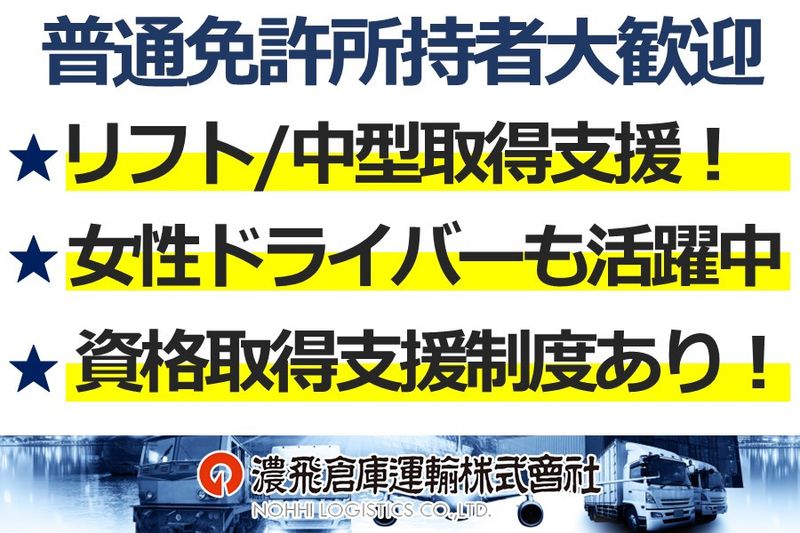 【仕事内容】 関東近郊にて集荷・配達を行う4tドライバーのお仕事です。 ドライバー未経験の方も丁寧に教えますので、お気軽にご連絡ください。 【この仕事のおすすめPOINT】 ■POINT① 老舗安定企業で福利厚生充実! ※格安寮あり(例:1R 6,000円~/月) ※=家族で入れる社宅あり ※昇給あり ※賞与あり ※退職金制度あり ※資格取得支援制度あり(中型・リフトなど) 他にも福利厚生大充実!長く安心して勤められる環境です! ■POINT② 女性も活躍中! 現在も、女性ドライバーが活躍中!無理なく働ける環境が整っています。 ■POINT③ 未経験・中型免許なしでもOK! 普通免許があれば、中型免許・リフト免許がない方でも大丈夫!資格取得支援制度であなたのキャリアアップを応援します! ■POINT④ 通勤ラクラク! ・車通勤OK!駐車場完備 ・電車通勤ご希望の方は舞浜駅から無料バスあり ・寮に入られる方は寮から乗り合いで出勤 車で通いたい方も、電車で通いたい方も、通勤ラクラクです! 【お仕事内容】 集配先は工場や倉庫、店舗などの企業間輸送のみです。 取り扱う商品は、食料品及びその原料や、工業製品、自転車などの多岐に渡りますが、重量物はリフトを使用するので体に負担はありません! 【年収】 モデル年収 380万~500万 監督クラスになると600万~も可能! 頑張り次第でしっかり昇給!退職金制度もあります! 【会社について】 当社は岐阜が本社の、創業100年を超える物流企業です。おかげさまで、現在も安定して事業を拡大中! 穏やかで居心地の良い社風、長く勤めやすい環境で離職率が低いのが自慢です。 20代から50代・60代の方までの幅広い年齢の男女スタッフが活躍中! 【求人ID-NH01】