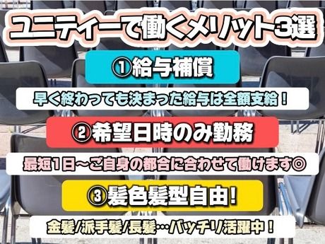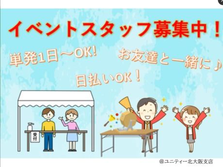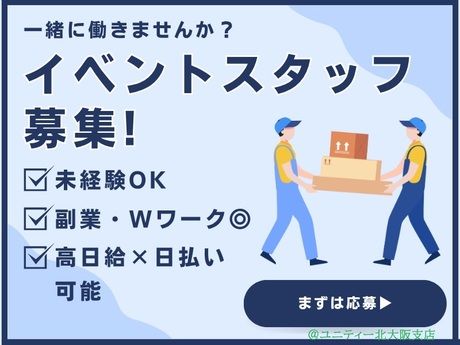選考プロセス まずは登録説明会にお越しください! 登録説明会は毎日10時半~もしくは15時~で行っております。 ~お仕事までの流れ~ 1.求人へのご応募 ↓ 2.登録説明会へのご来社 ↓ 3.お仕事の流れをご説明(約1時間程度) ↓ 4.お仕事のご案内(弊社指定のアプリや電話等) ↓ 5.お仕事の確定 ~お仕事当日の流れ~ 1.起床・出発連絡(弊社指定のアプリにて) ↓ 2.リーダーと合流 ↓ 3.お仕事開始 ↓ 4.お仕事終了 ↓ 5.勤務報告(弊社指定のアプリにて) ↓ 6.お給与の振り込み(1週間~10日程) 最近TikTok始めました!お願いします! https://bit.ly/3D1uPkC 【問合せ先について】 問合せ先:06-6568-9777 登録説明会の会場について 大阪市北区豊崎3丁目20-9 三栄ビル5階 ・御堂筋線「中津」駅4番出口より徒歩1分 ・JR大阪駅より徒歩10分 【株式会社Unity】