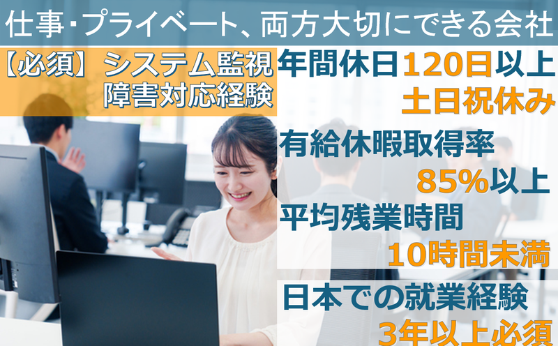 求めている人材 【必須条件】 ・システム監視業務・障害対応経験3年以上 + ・Excelの基本操作スキル (報告書・工程管理表作成など) + ・顧客との調整業務に必要な コミュニケーション力 【歓迎条件】 ・監視システムの知識・操作経験 Zabbix, JP1, Senju などの 監視ツールの利用経験、 監視項目・しきい値設定、 アラート通知設定の理解 ・障害一次対応スキル アラート発生時の初動対応、 切り分け、暫定対応、 監視システム自体の障害 (サービス停止やエージェント 不具合など)の復旧経験 ・ドキュメンテーションスキル 手順書や障害対応履歴の 記録・整備 ・ジョブ管理の知識 ジョブスケジューラ (JP1, Control-M, Systemwalker 等)の 基本操作、ジョブ登録・ 変更・実行確認の経験 ・スクリプト作成・自動化経験 Shell, PowerShell, Python などを用いた運用自動化 ・監視設計・改善提案の経験 監視項目の最適化、 運用効率化の提案 ・ITILや運用プロセスの知識 インシデント管理、変更管理、 問題管理の理解 【こんな方にオススメ!】 ・システム運用に興味がある方 ・安定したIT環境を支える やりがいを感じたい方 ・チームでの協力を大切にできる方 ・新しい技術や知識を 積極的に学びたい方 異業種からのキャリアチェンジも 歓迎します。当社では以下のような 転職事例もあります。 ・製造業マシンオペレーター → 実験評価 → 設計補助 → 設計/解析 → マネジメント/顧客調整 ・接客業/営業/事務職 → システム開発(テスト工程担当) → Webシステム開発PG(フロントエンド) → Webシステム開発SE(バックエンド) 未経験からでも、教育体制が 整っていますので、意欲のある方は ぜひご応募ください。