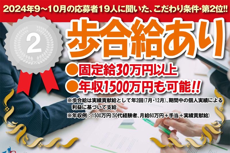 月給300,000円以上 給与詳細 ※基本給・固定残業代の総額 基本給:月給 22万円 〜 固定残業代:あり 1ヶ月あたり8万円 〜(固定残業時間:1ヶ月あたり42時間) 固定残業時間を超えた勤務時間については別途残業代を支給する 【一律手当】 全員に一律で支払われる通勤・皆勤・家族手当金額:なし 全員に一律で支払われるその他手当金額:なし ◎あなたの年齢・経験・家族構成等を十分に考慮します。 ◎とくに経験者は前給を考慮の上、優遇します! ☆他に実績貢献給あり。 年2回(7月・12月)、期間中の個人実績による利益に基づいて支給します。 【手当】 ☆下記手当を別途支給します。 ・残業/休日出勤手当:超過分 ・通勤手当 ・車両手当 ・役職手当 【給与例】 給与例 【年収例】 700万円:30代・経験者(月給35万円+手当+実績貢献給 1200万円:40代・経験者(月給50万円+手当+実績貢献給 1500万円:50代・経験者(月給60万円+手当+実績貢献給