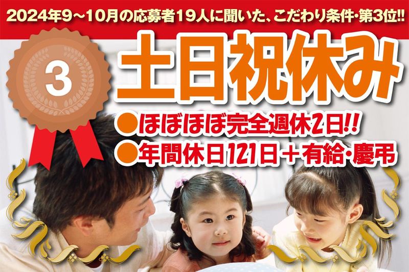 休日休暇 完全週休2日制:土日 祝日 GW・夏季・冬季大型休暇 ☆年間休日125日+有給・慶弔休暇