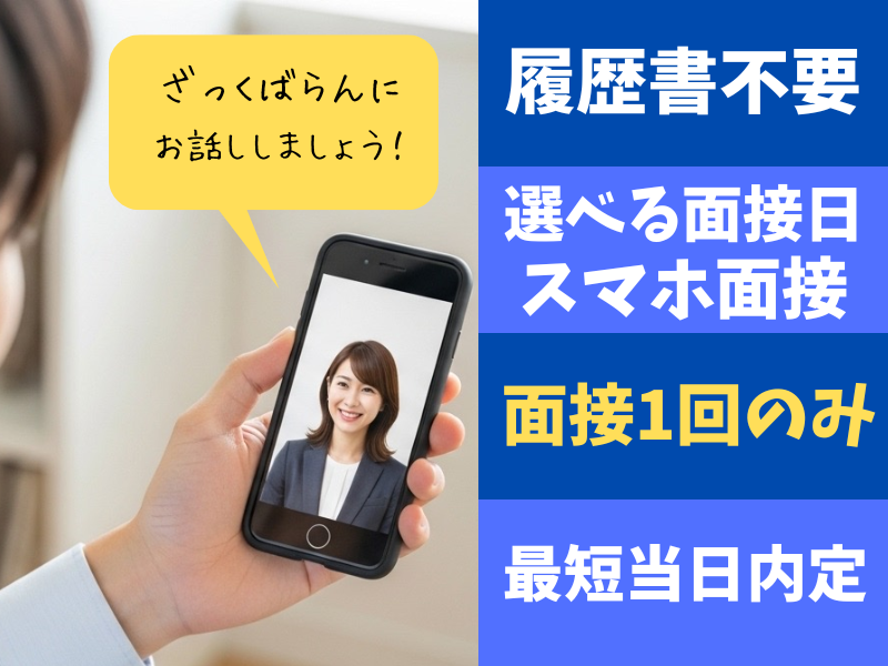 求める人材: 未経験OK・経験不問! とってもシンプルな作業なので、 初めての工場ワークにもぴったり! 異業種からの転職者もたくさん活躍中です◎ (直近:食品系、スーパーなど) <<20代~50代の男女が活躍中!>> \事前準備ナシですぐ応募OK/ 面倒な履歴書も必要ありません。 しかも面接は1回だけ* 自宅から受けられるWEB面談にて、 ざっくばらんにお話ししましょう(^^) 気楽な普段着でOKですよ◎ お気軽にお問い合わせください!