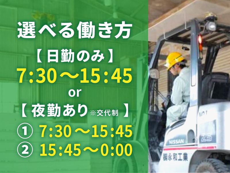 仕事内容 【40代・50代の未経験者多数活躍中!】 ◆旭化成建材(株) 穂積工場内でヘーベル (軽量気泡コンクリート製の外壁材)製造業務全般をお任せします。 ◆担当の先輩がマンツーマンで教えます◎一人で作業ができるようになるまでしっかりサポート!「工場勤務は初めて」という方も安心です◎ 【主な仕事内容】 下記いずれかの作業を担当いただきます。 (1)セット ◆指定された種類・サイズの鉄筋を準備 ◆ボタン操作などで調整しながら鉄筋を固定 ◆品質チェック (2)加工作業 ◆材料の準備 ◆切断機を使用し、所定の寸法にカット ◆切断後の製品の品質チェック、運搬作業 (3)補修作業 ◆カケや傷、凸凹のチェック ◆モルタルをコテで成形・補修 ◆乾燥後のヤスリがけ、表面の仕上げ、最終チェック 【この仕事のポイント】 ✅ シンプルな作業で覚えやすい! 流れが決まっているので、未経験でも始めやすい仕事です◎ ✅ 体力より丁寧さが大事 機械操作や手作業が中心で、重労働は少なめ。コツコツ進めるのが得意な方にぴったり! ✅ 資格取得もサポート! フォークリフト免許などは入社後の取得OK。費用は会社が全額負担します◎ ✅ 安定業界で長く働ける 建材ニーズが安定しているため、将来も安心。未経験でも月収25万円以上可能! 【その他の嬉しいポイント】 ✅選べる日勤専属or夜勤※途中変更も可 ・プライベート重視▶日勤(7:30~15:45) ・がっつり働いて稼ぎたい▶夜勤もある交代制勤務(7:30~15:45、15:45~0:00) ✅大手工場ならではの福利厚生あり! ・工場内食堂で、ラーメンやカレー、うどんが100円代で食べられます♪ ・無料のお風呂施設あり!夏には仕事終わりにお風呂に入ってサッパリ♪ 【社員インタビュー】 ◆製造スタッフ/36歳 入社2年目 今は製品を切断する機械の操作を担当しています。シンプルな作業の繰り返しで、難しいとかキツイと感じたことはありません。 将来的には加工だけでなくセットや仕上げなど、すべてをマスターするオールラウンダーを目指します。あと、有給で休みたい日に休めるのもありがたいですね。 【電話応募・問い合わせ大歓迎!】 058-326-4848(採用担当まで) 「ちょっと気になる」そんな方も歓迎!お気軽にご連絡下さい♪