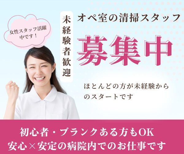 仕事内容 手術室内の清掃をお願いします。 ・リネン、廃棄物回収・清拭 ・備品補充・機械搬送 ・環境整備等 手術で使用する器材を安全に使えるように準備するお仕事です。 慣れてきたら医療器具(医療用ハサミやピンセット等)のピッキングや備品補充などもお願いいたします。 患者さんとの接触はありませんのでご安心ください。 【職場環境】 20代、30代、40代の男女スタッフが活躍している職場です。 困ったことがあれば周りがすぐにサポートしてくれるので、とっても働きやすい職場です。